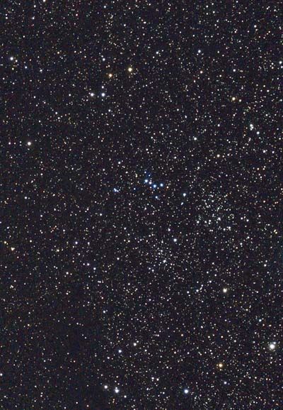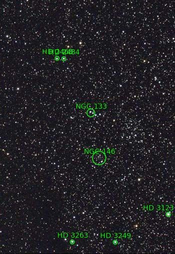 Der offene Sternhaufen NGC 133 im Sternbild Kassiopeia ist ein faszinierendes Beispiel für eine junge Sternansammlung, die sich in relativer Nähe zu unserem Sonnensystem befindet. Entdeckt wurde er im Jahr 1829 vom Astronomen John Herschel, der ihn als einen eher spärlichen und wenig konzentrierten Haufen beschrieb, der sich kaum vom Hintergrund der Milchstraßensterne abhebt. Während seine schlichte Erscheinung ihn für das bloße Auge unsichtbar macht, offenbart ein Blick durch ein Teleskop eine lose Gruppe von etwa 20 bis 30 Sternen, die sich über einen Durchmesser von rund 1.400 Lichtjahren erstreckt.
