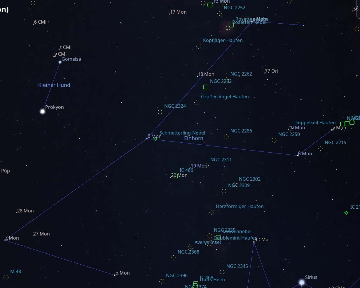 NGC 2264 (Weihnachtsbaum-Sternhaufen & Konusnebel) | 3,9 | 06h 41m / +09° 53′ | Offener Sternhaufen & Emissionsnebel | Das Objekt besteht aus einem Sternhaufen, der wie ein Weihnachtsbaum geformt ist, und dem dunklen Konusnebel. |