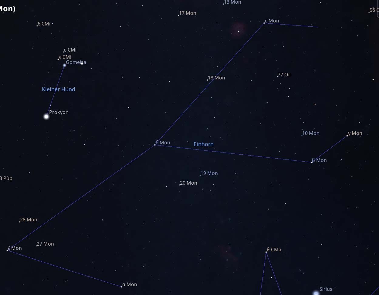 Gamma Monocerotis (γ Mon) | 3,99 | 07h 43m / -03° 10' | K3 III | Ein orangefarbener Riesenstern. |