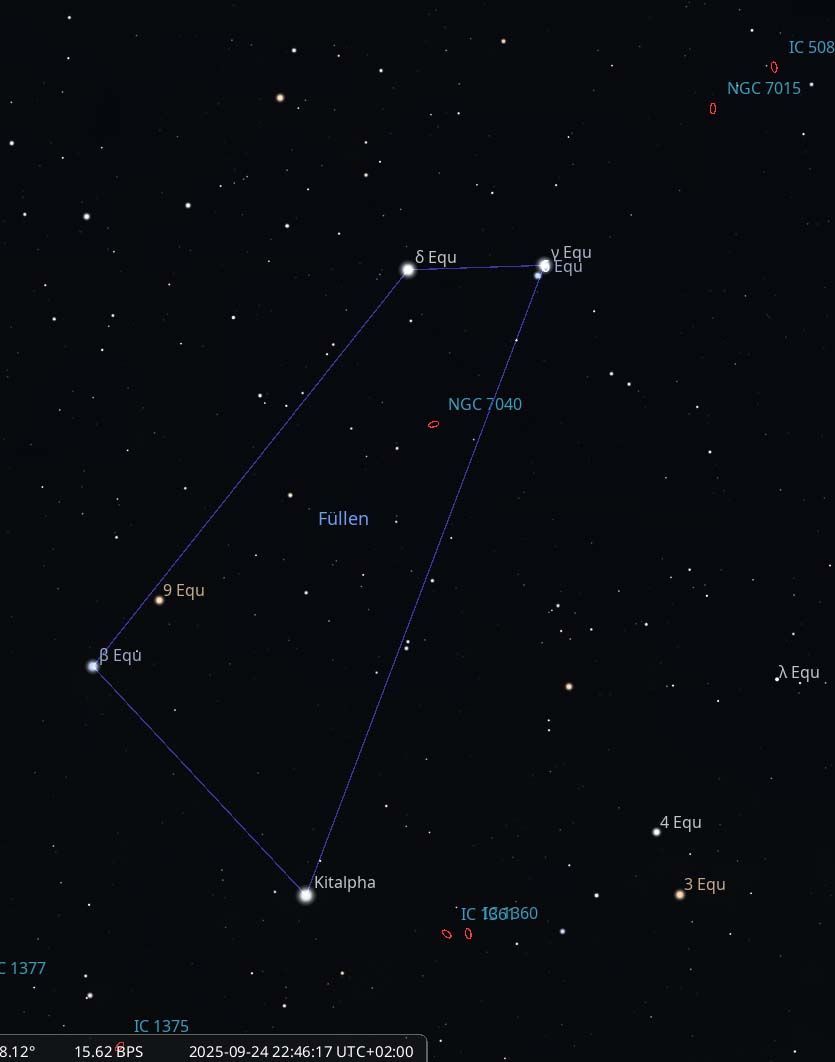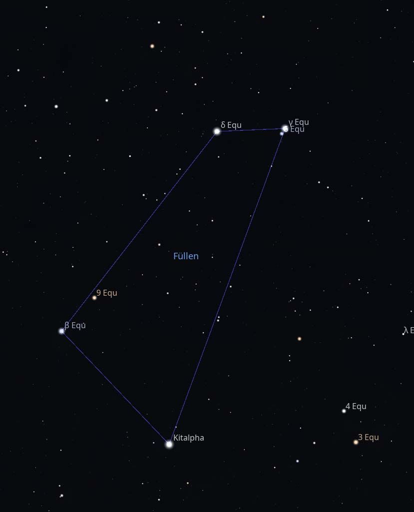 Doppelsterne: Das Füllen ist die Heimat einiger bemerkenswerter Doppelsternsysteme, die für Hobbyastronomen eine lohnende Herausforderung darstellen. Der hellste Stern, Kitalpha (α Equulei), ist ein spektroskopisches Doppelsternsystem. Das bedeutet, dass seine zwei Komponenten so eng beieinander liegen, dass sie selbst mit leistungsstarken Teleskopen nicht getrennt werden können. Ihre Existenz wurde durch die Analyse von Verschiebungen in ihrem Lichtspektrum nachgewiesen. Ein weiteres interessantes System ist γ Equulei, das aus einem relativ hellen Hauptstern und einem lichtschwächeren Begleiter besteht, der in der Nähe kreist. Für Beobachter mit kleinen Teleskopen kann die Trennung dieser beiden Sterne eine spannende Aufgabe sein.