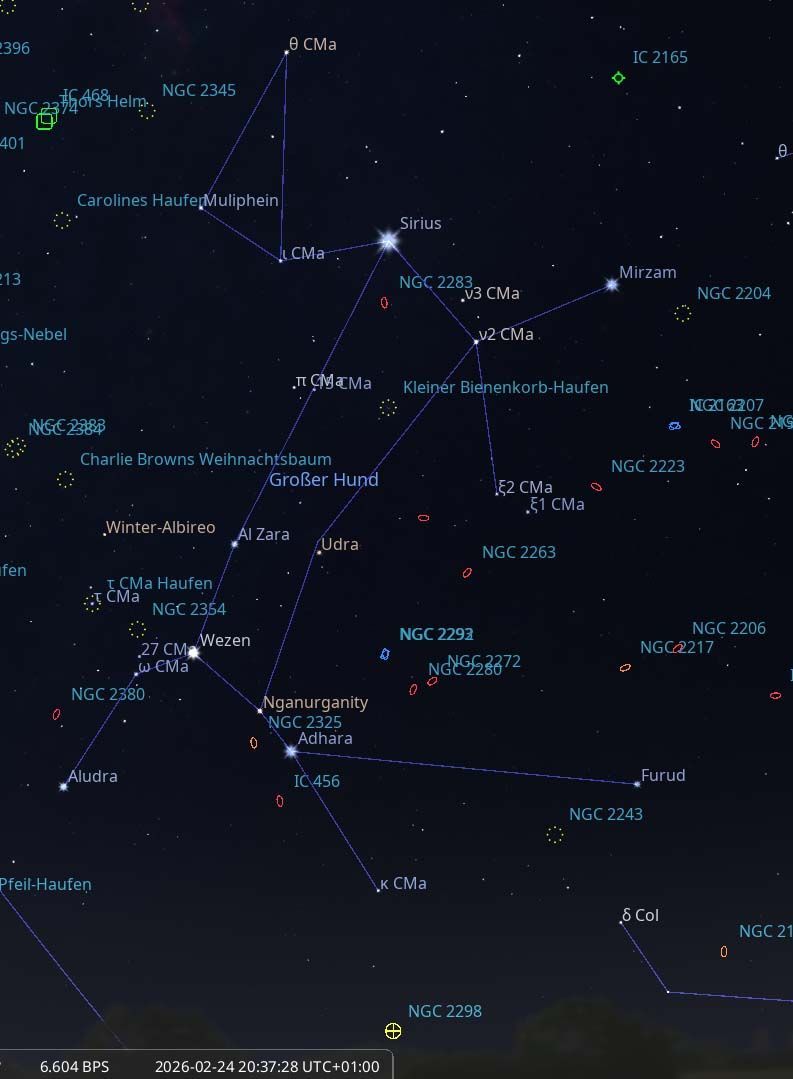 Das Sternbild Großer Hund (Canis Major) ist eine der reichsten Konstellationen am südlichen Nachthimmel, wenn es um Deep-Sky-Objekte (DSOs) geht. Es liegt in der Ebene unserer Milchstraße, was es zu einem idealen Gebiet für offene Sternhaufen macht. Im Gegensatz zu den Fischen oder dem Füllen gibt es hier kaum ferne Galaxien.