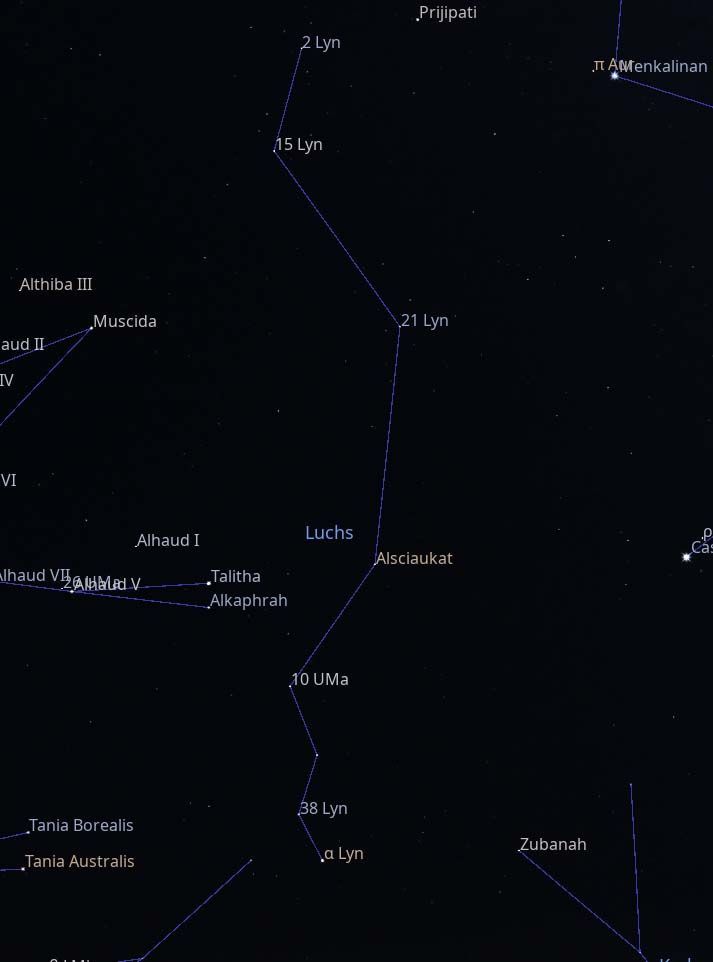 10 Ursae Majoris (10 Uma): Obwohl dieser Stern die Bezeichnung „Ursae Majoris“ trägt, was auf das Sternbild Großer Bär hinweist, befindet er sich tatsächlich innerhalb der Grenzen des Sternbilds Luchs. Es ist ein Kuriosum der historischen Sternenkatalogisierung, da die Sternbildgrenzen erst später festgelegt wurden. Mit einer scheinbaren Helligkeit von 3,97 mag ist er der dritthellste Stern im Luchs und somit ein relativ auffälliges Objekt für dieses ansonsten lichtschwache Sternbild. Er ist ein gelblich-weißer Stern, der uns in etwa 153 Lichtjahren Entfernung liegt. 10 UMa ist ein Riesenstern und ist dabei, sich von der Hauptreihe zu entfernen. Seine Masse ist fast doppelt so groß wie die unserer Sonne, und er ist wesentlich leuchtkräftiger.