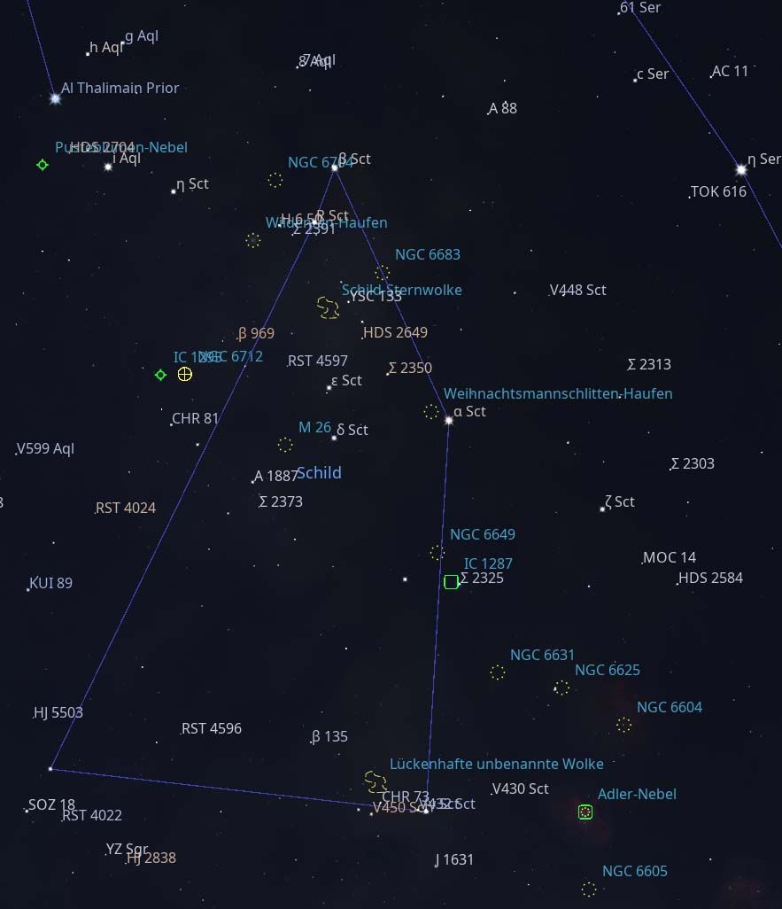 Das unscheinbare Sternbild Schild (Scutum), das zwischen den prominenten Sternbildern Schütze und Adler liegt, mag auf den ersten Blick unscheinbar wirken, ist aber ein wahres Schatzkästchen für Deep-Sky-Objekte (DSOs). Die Region liegt mitten in der Milchstraßenebene, was eine außergewöhnliche Dichte an Sternhaufen, Nebeln und Galaxien bedeutet. Für Amateurastronomen und Astrofotografen ist der Schild daher ein lohnendes Ziel, insbesondere in den dunklen Sommernächten.