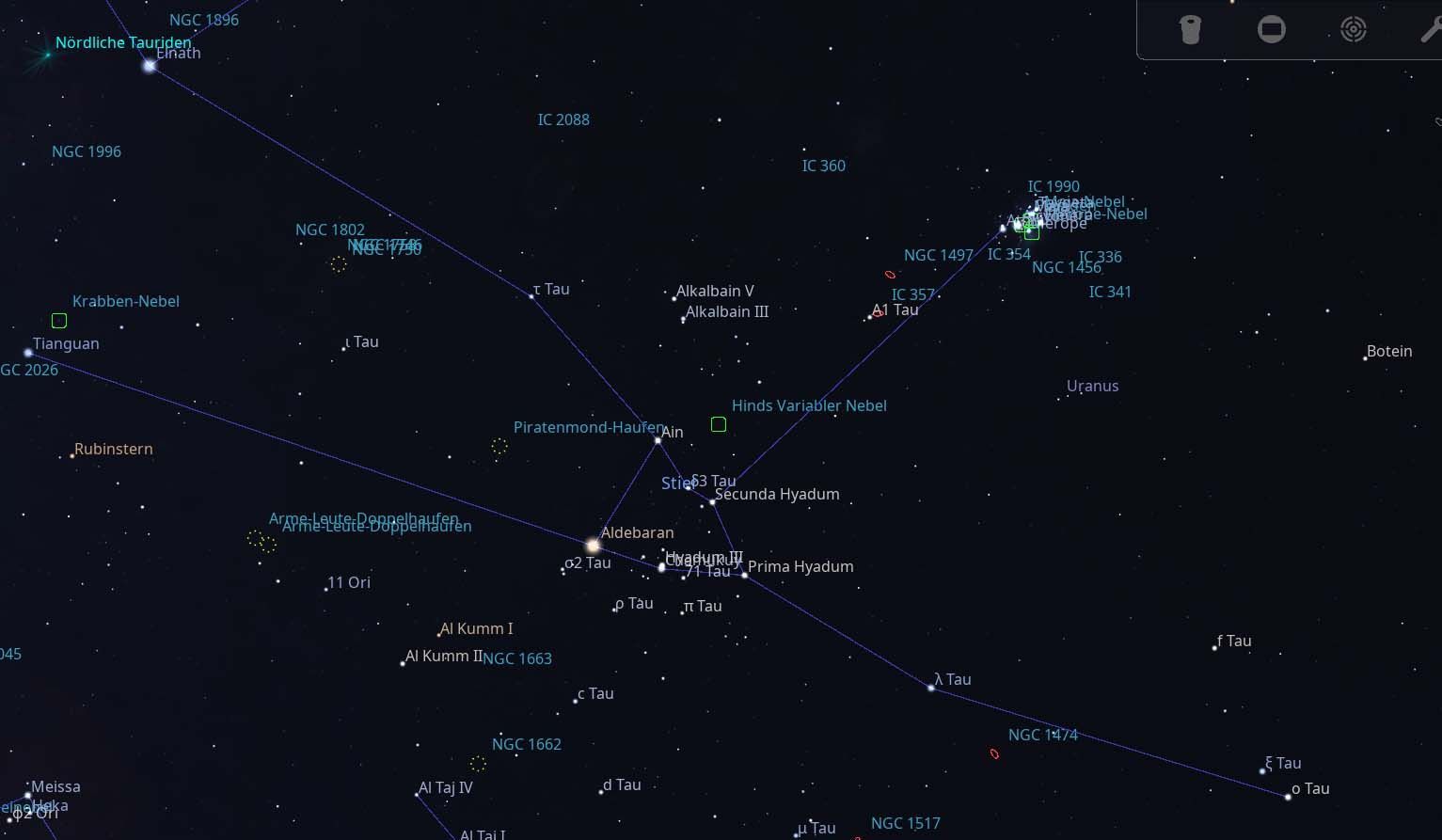 Die Hyaden: Die Hyaden sind der nächstgelegene offene Sternhaufen zur Erde und bilden den markanten V-förmigen Kopf des Stiers. Sie sind deutlich älter als die Plejaden, mit einem geschätzten Alter von rund 625 Millionen Jahren. Mit bloßem Auge kann man sie als ein lockeres Sternenmuster erkennen. Die Hyaden haben eine wichtige Rolle bei der Bestimmung der kosmischen Entfernungsleiter gespielt.
