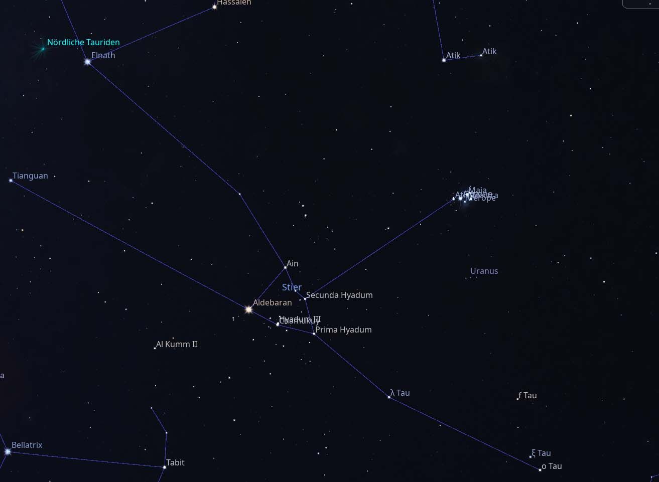 Meteorströme: Der Stier ist der Radiant von zwei bedeutenden Meteorströmen, den Nördlichen und Südlichen Tauriden. Diese Ströme sind bekannt für ihre langsamen und oft hellen Meteore, die manchmal als "Feuerbälle" erscheinen. Sie sind das Ergebnis von Trümmern des Kometen Encke und sind in den Monaten Oktober und November aktiv.